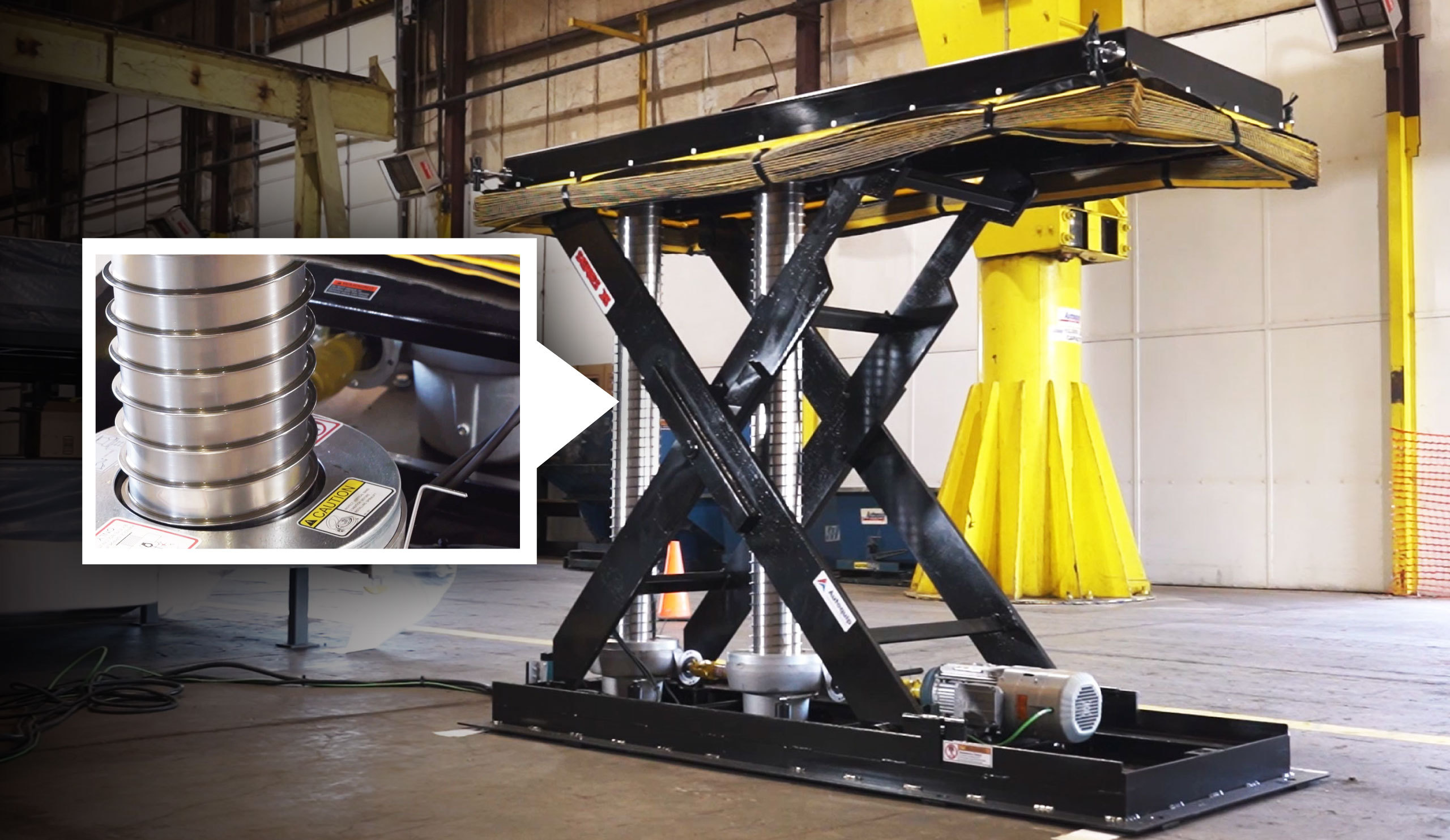 Mechanical lifts offer a high-level of precision and accuracy that are ideal for integrating with automated equipment or conveyor systems where repeatability is key. Driven by electro-mechanical positioning systems such as stacking chains, spiral columns or vertical ball screws, this type of lifting technology provides stable load support throughout the lift’s travel. Programmable mechanical drive (PLCs) allows mechanical lift tables to be called/sent to multiple predetermined levels, which is a critical asset for alignment and precision applications.