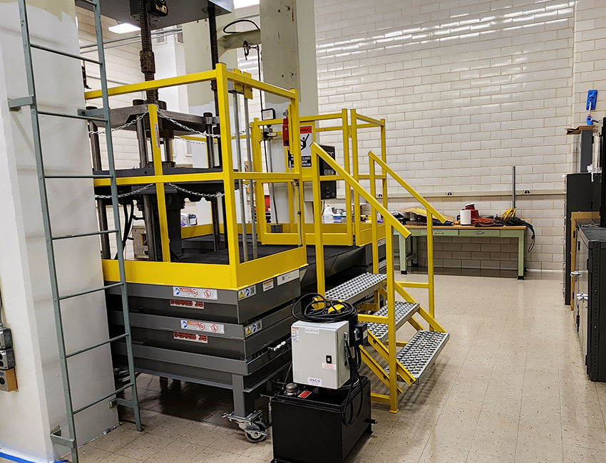 The National Institute of Standards and Technology contacted our dealer, Alpha Material Handling for unique project requiring the replacing of material handling lifts that were first installed in their facility in the 1960s. They wanted to update the lifts to a more ergonomic work platforms that their personnel would use to work on their measuring devices. However, the real challenge was how to get the new, larger lifts to the designated rooms in their facility? Once the lifts arrived at the dock, they would have to travel through a hallway, down a freight elevator to another hallway and finally through double doors. Everything had to be bolted together as well, no welding in the rooms. In addition, there are tight spaces between columns, and the lift needed to be in a U-shape to fit around NIST’s equipment. The height requirements were quite difficult as well resulting in very specific travel requirements of each lift.