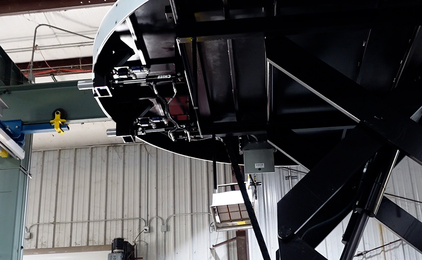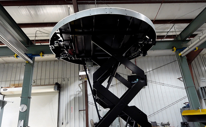 The customer required a solution to bring engines up from a below-grade work area to a comfortable and safe height for servicing. In addition to smooth, vertical travel, the lift system needed to work within the constraints of an existing iris floor mechanism. The iris platform opens/shuts around the engine securing it onto of the lift platform so work can be safely conducted on the jet engine.