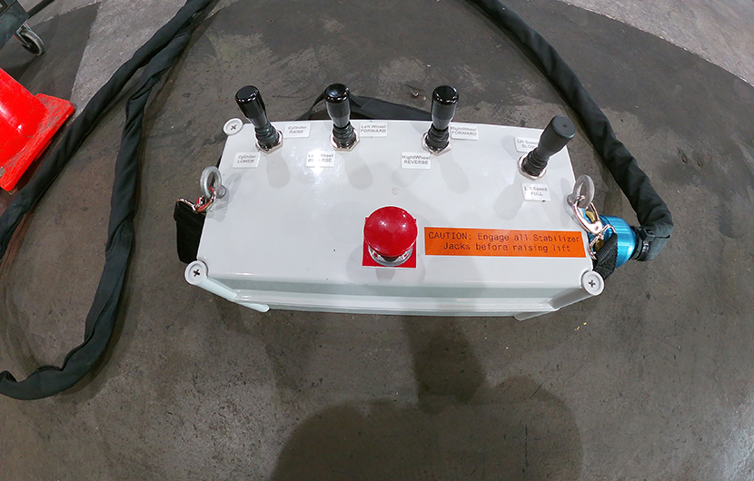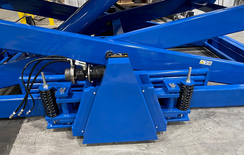 Autoquip’s custom design offered a mobile base and scissor lift to evenly transport and position the engine under the test stand attachment. The design required maximum maneuverability, so the mobile base was equipped with an independent air-powered drive allowing for omnidirectional steering.