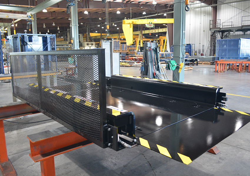 The engineering team at Autoquip created a new low profile articulating lift design which included special gravity-actuated wheel stops and a plate that AGV sensors could easily locate. When the lift is raised the wheel stops come up and the cart cannot move until lift is lowered to floor. This prevents inadvertent collisions with the equipment. When the lift is lowered an AGV caring product comes on the lift and product is raised up for customer’s ergonomic use. Then lowered and AGV drives off.
