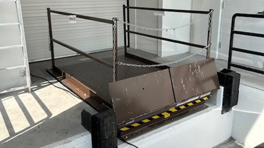 Autoquip engineered a custom dock lift designed to sit flush with the finished dock floor when lowered. The lift was built with an 8,000 lb. capacity to handle heavy loads and included an upgraded 72” x 18” split bridge—larger than the standard 72” x 12”—to provide greater versatility in bridging the gap between dock and trailer.