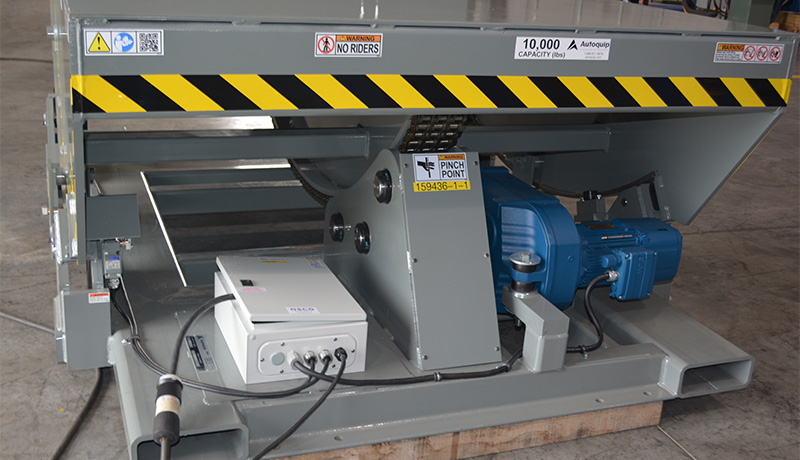 Autoquip specializes in designing custom tilting systems and the best solution for the customer’s requirements called for an uncommon tilt product from our extensive design library, affectionally known as “The Pac Man” lift. This specially designed mechanical tilter rotates within its own footprint keeping within the lift base at 112” for a non-intrusive rotation.