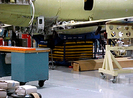 A manufacturer of small jets was researching various means to improve the process of attaching the wing to the fuselage of a business jet. The current method of using adjustable jack stands to perform this task takes too long and requires the assistance of too many people. This customer specified a lifting “tool” which would overcome all the challenges of this application: 1) weight of fuselage and wing must be supported by one lift, 2) lift must be able to transport the wing, or wing plus fuselage, from one station to another, 3) lift must be able to operate at two different speeds – either fast (while the wing is being raised between lowest and highest elevations) or slow (while the wing is being positioned for attachment).